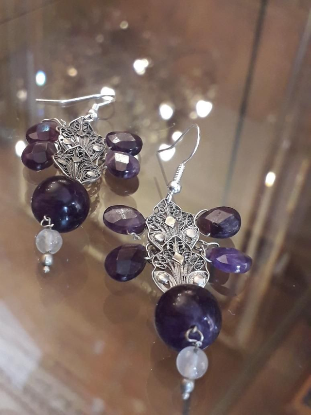 Boucles d'oreilles améthyste, cristal de roche, argent.