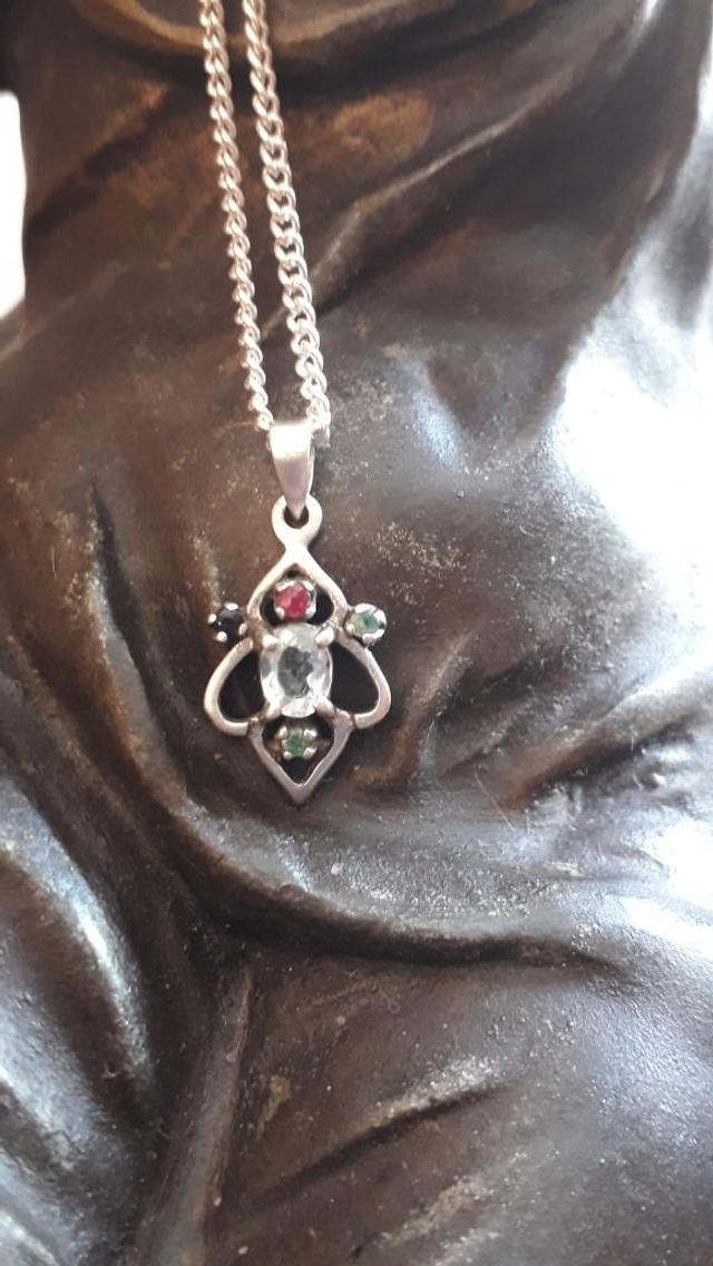 Pendentif aigue marine, rubis, saphir, émeraude, argent 925.