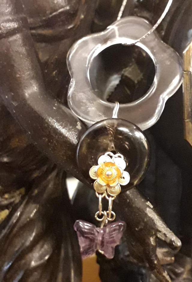 Pendentif cristal de roche, quartz fumé, améthyste, vermeil, argent 925/1000.