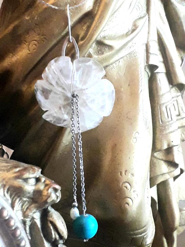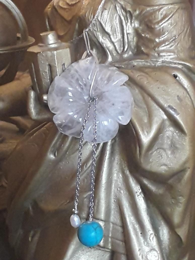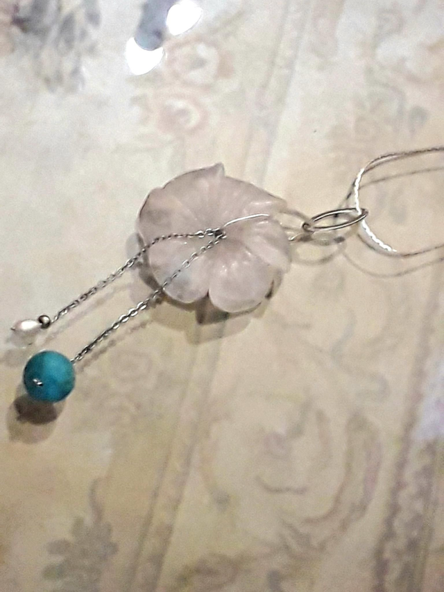 Pendentif quartz rose, turquoise, perle de culture, argent