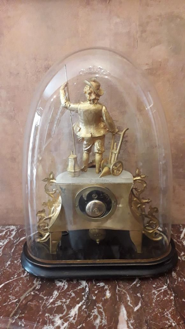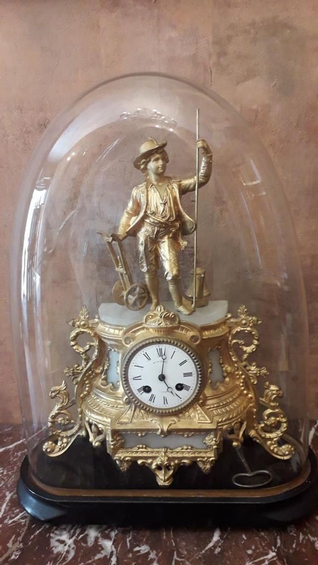 Pendule 1900, régule doré, avec sa clef et balancier. Mécanisme révisé. Parfait état. Globe et support ancien , non fêlé.