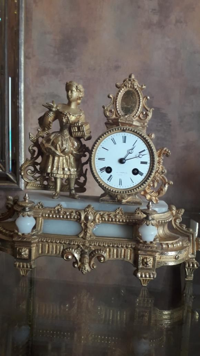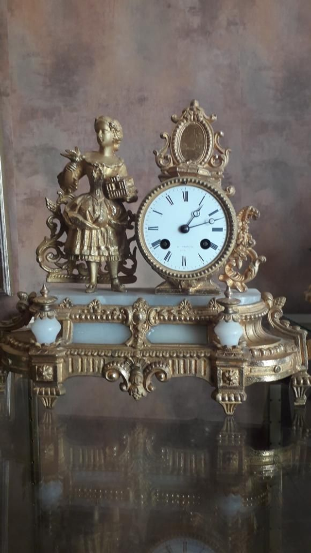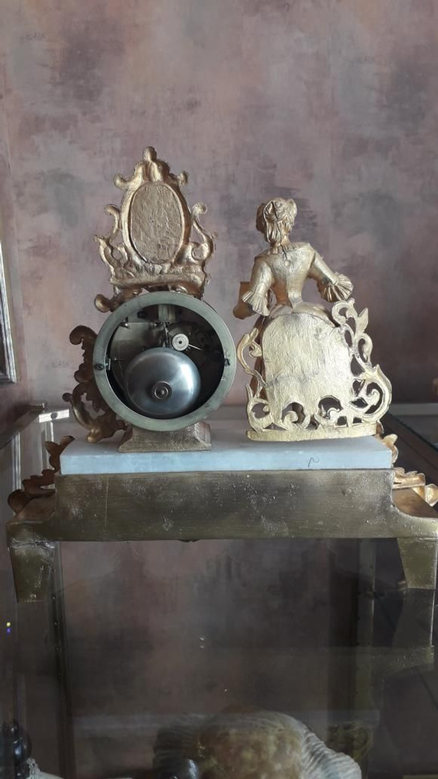 Pendule ancienne régule doré. Année 1895. Sujet femme au miroir. Mouvement de Paris, avec sa clef et son balancier. Bon fonctionnement.